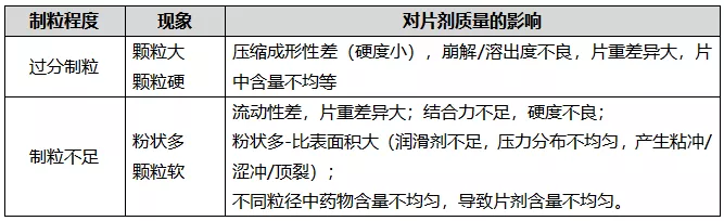 片劑性質(zhì),如崩解性、溶解性、含量均勻性、片劑的硬度等主要是由制粒工程賦予;壓片過程中出現(xiàn)的不良現(xiàn)象,如粘沖、頂裂、澀沖、重量差異等也與制粒工程相關(guān)??梢哉f制粒工程是保證片劑質(zhì)量的關(guān)鍵步驟。目前制粒中存在兩個(gè)常見問題,一是過分制粒,二是制粒不足。