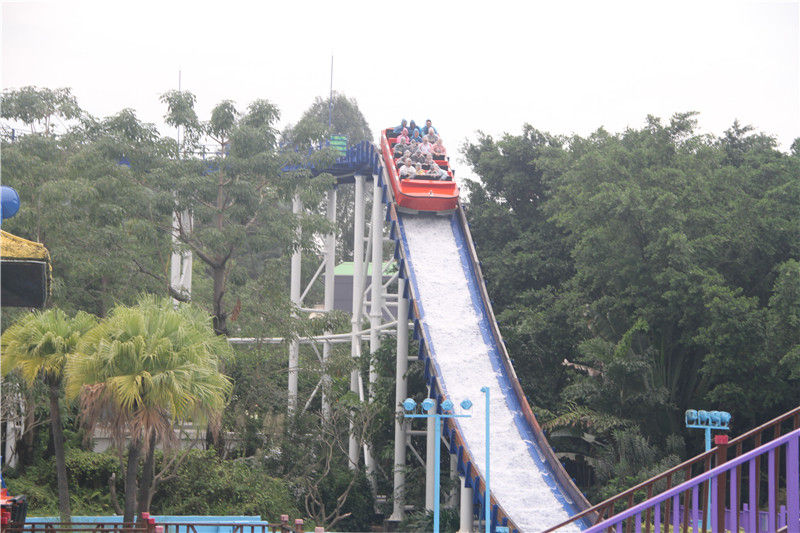 【激流勇進】小伙伴化身“生態(tài)俠”,進入大自然未知世界接受各種挑戰(zhàn)。當游船提升至一定高度的陡坡上,然后從高處滑下,沖入水中,濺起水花,小伙伴們在失重的作用下情不自禁尖叫吶喊,并且在坡地的水池中被自己濺起的水花淋濕,刺激又有趣。